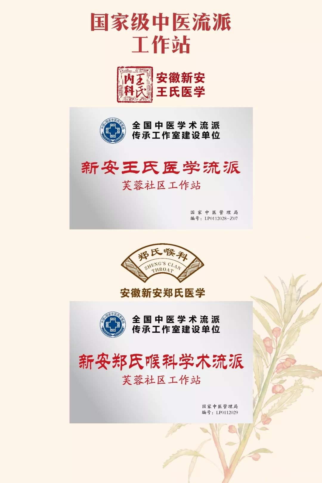 允和国医馆是新安"王氏内科”和"郑氏喉科”国家级中医传承流派工作站。由两家流派工作室与芙蓉社区共建,在全国尚属首例。2012年国家中医药管理局遴选了全国首批64家中医学术流派传承工作室建设单位。安徽仅有传承近200年的新安"王氏内科”与传承近500年的新安"郑氏喉科”两家入选。