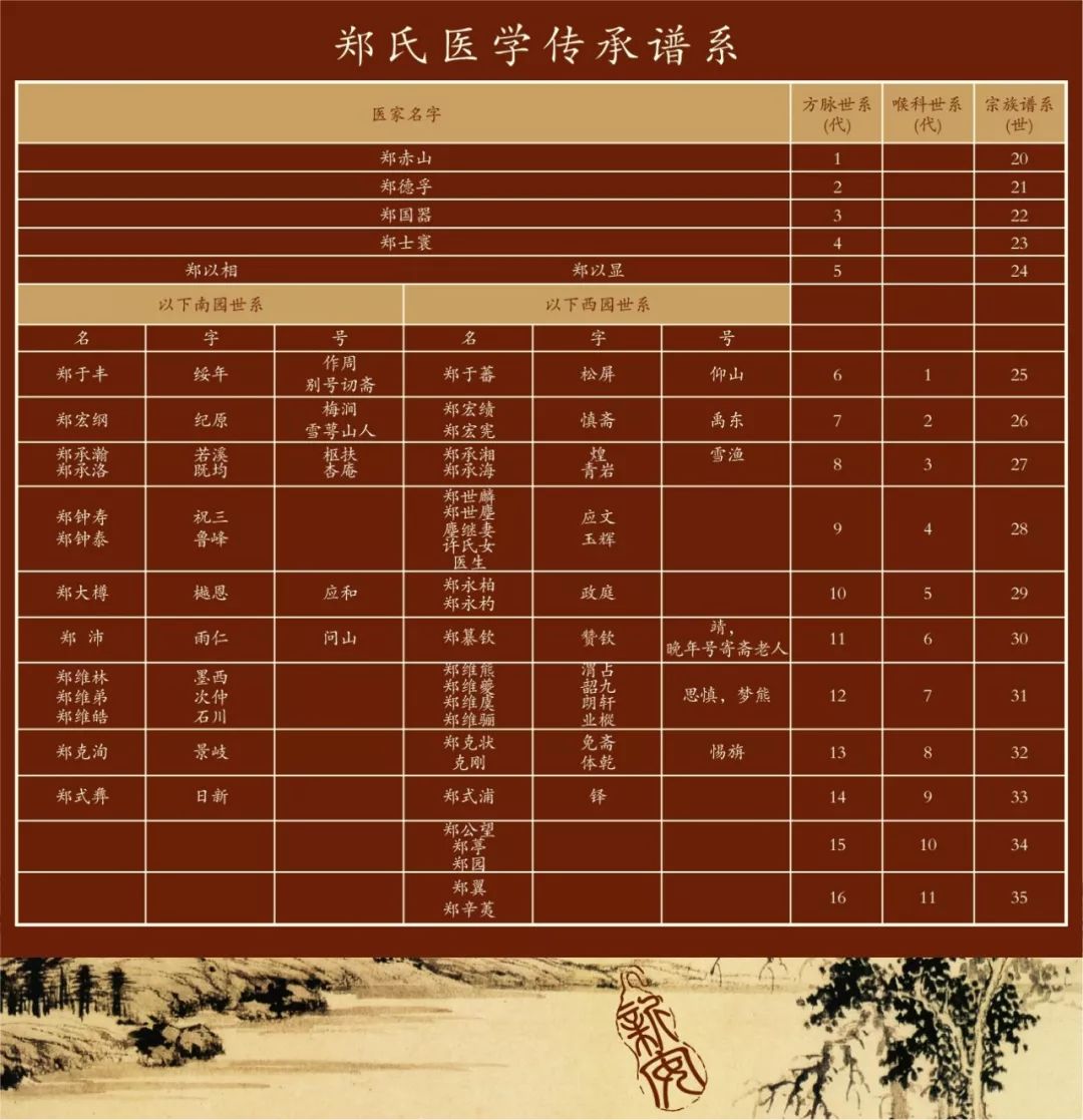 新安郑氏喉科起源于明代嘉靖初年(约1521),迄今历传500年16世,名医辈出,代有传人。1-5代主攻内科(大方脉),6-16代主攻中医喉科,兼理内科、儿科(大小方脉)。
