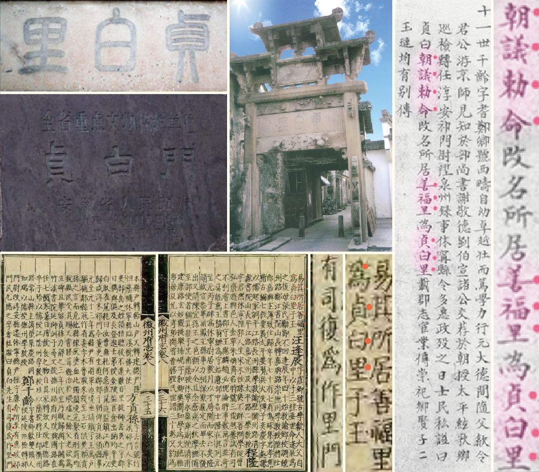 古有 "朝议敕命”、"有司复作”的记载:清·道光郑氏谱牒精华本《郑村人物类略》"朝议敕命。改名所居善福里为贞白里”,即朝廷议定,皇帝敕命(见图)。明·弘治木刻板《徽州府志》记载"有司复作里门,易其所居'善福里’为'贞白里’”(见图)。有司:(政府)有关部门,示贞白里门坊为政府奉敕建造。